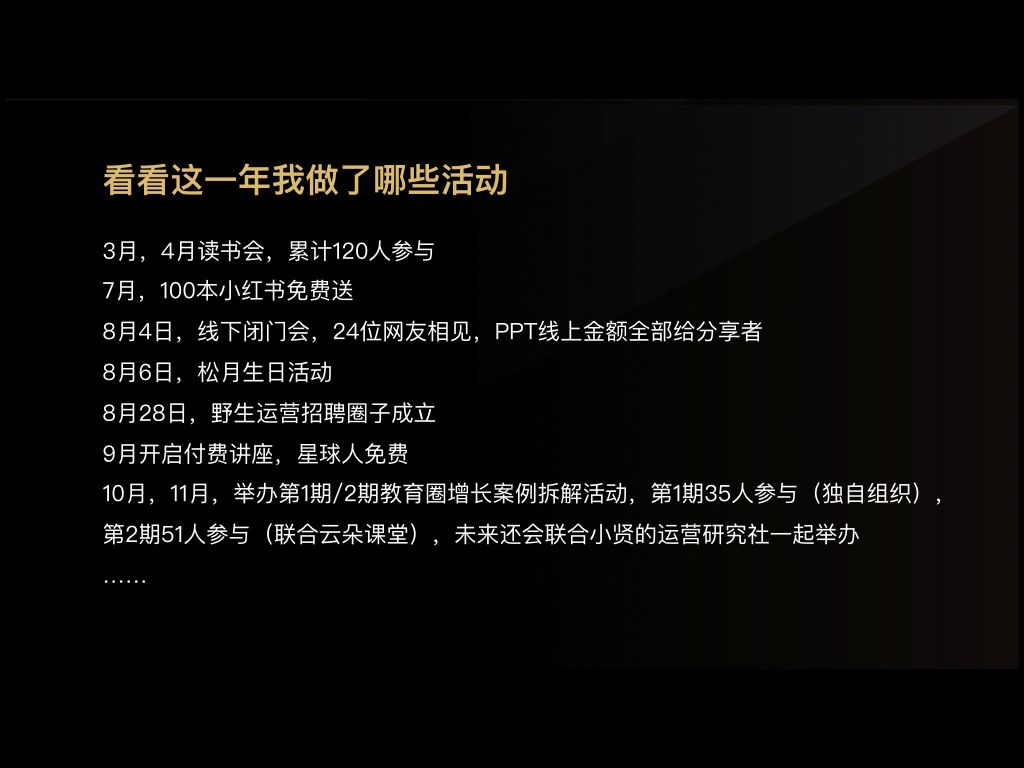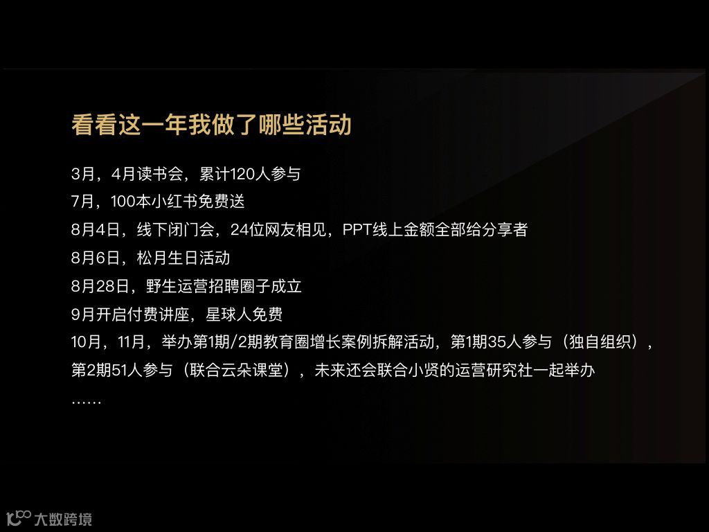 3)今年8月在北京举行了首次线下闭门会,主题是围绕在线教育和知识付费增长,每个参加的人都必须准备分享,不过问题也有,就是大家真的干货太多,时间拉的非常长,最后不得不把一些分享转移到线上继续。不过松月毕竟精力有限,线下见面举办的还是太少,未来希望分舵的小伙伴能扛起一面大旗。