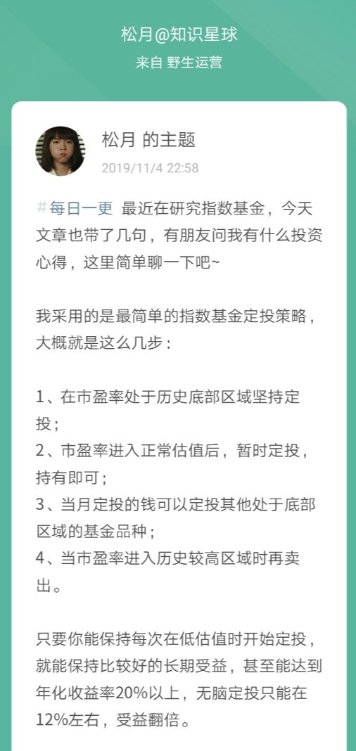 星球内容更新,星球内容比较短小,输出压力也没那么大,目前已经建立了资料分享、运营干货、读书笔记、星球活动、人生思考等十几个标签,基本保持日更,定位是松月和独孤伤的运营心得分享,也会分享一些比较轻松的话题,拉近大家的距离,毕竟都是活生生的人,生活中的其他方面也想和大家分享,比如前段时间在星球里分享了松月买基金的操作经验,反馈也蛮好的: