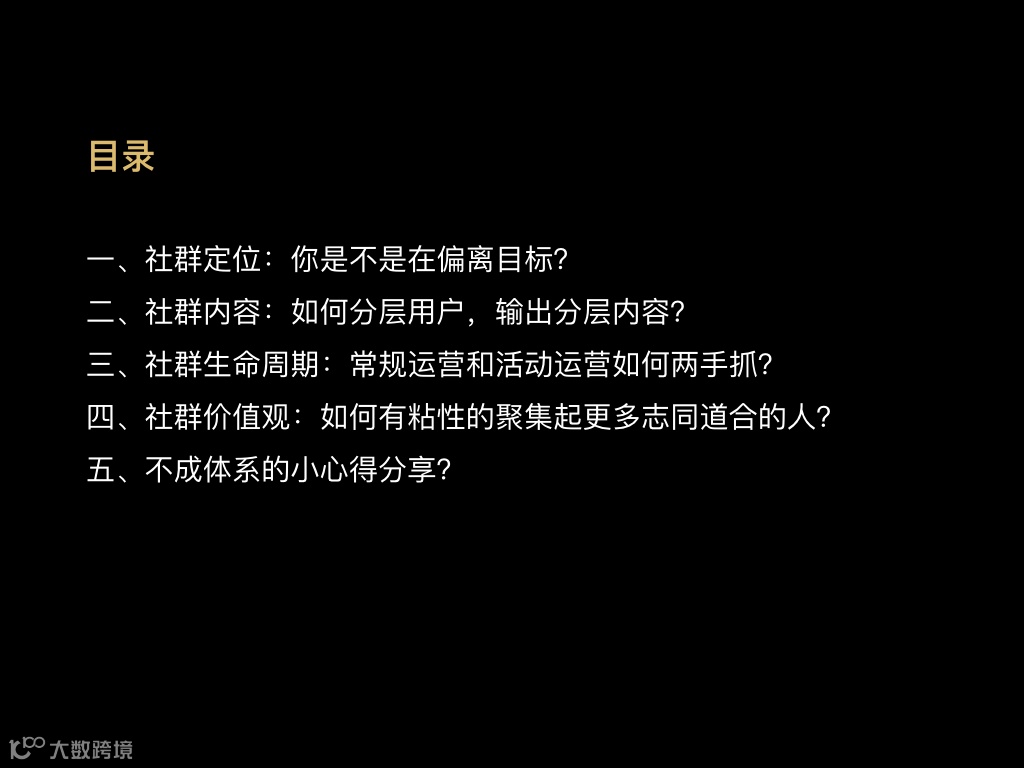 废话说了那么多,下面正式进入今天的分享,我今天要分享的主题是《如何持续输出价值,打造“3高”社群》,何为三高,即高质量、高活跃、高链接,下面我会从下面5个方面告诉你,我是怎么做的,才能做到如此。