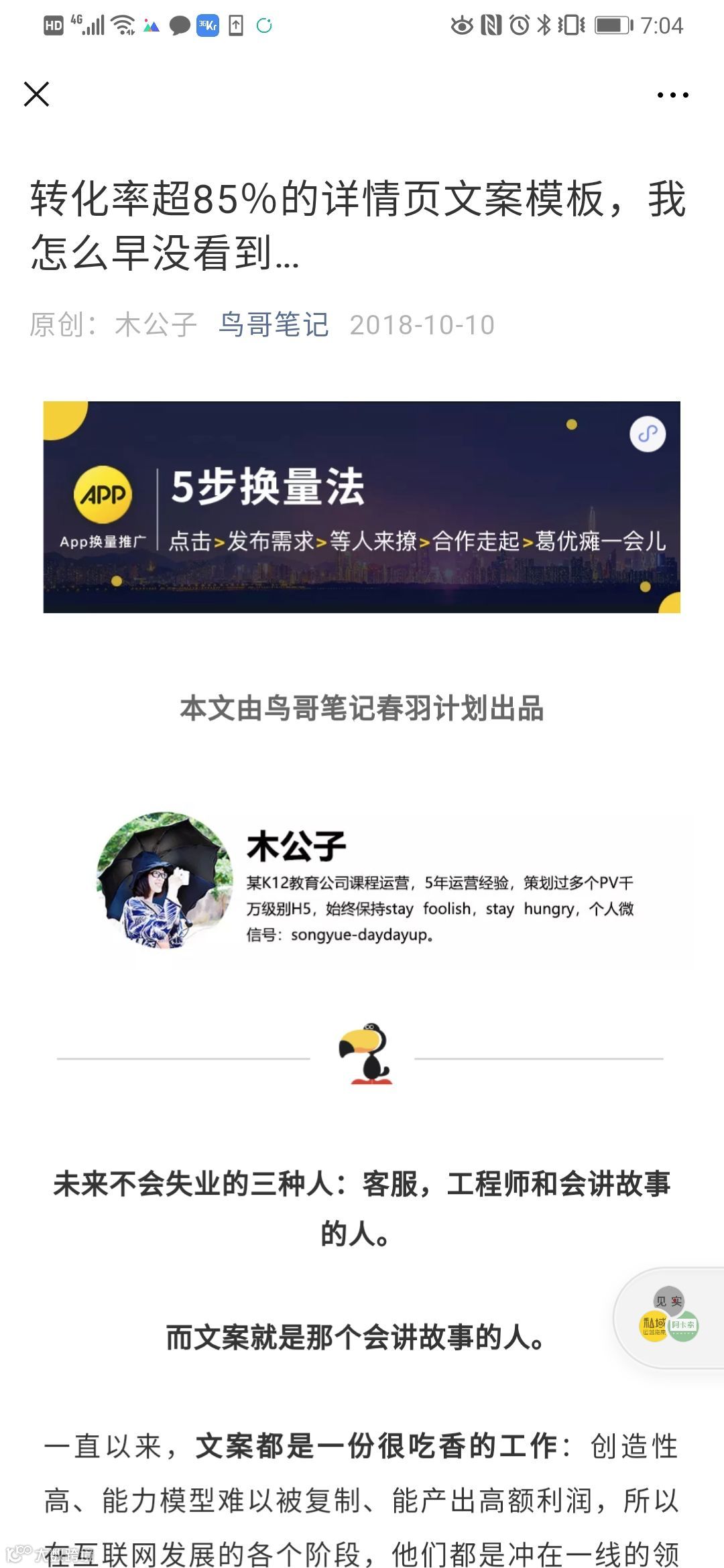 第二次我学聪明了,因为我的目标是要跟更多运营和产品的人交流,且聚焦于在线教育和知识付费领域,于是第2篇文章我输出了一篇自己的经验总结,在作业帮之前的公司我是全栈运营,产品、用户、文案全都是自己搞,于是这篇文章诞生了《转化率超85%的详情页文案模板,我怎么早没看到…》