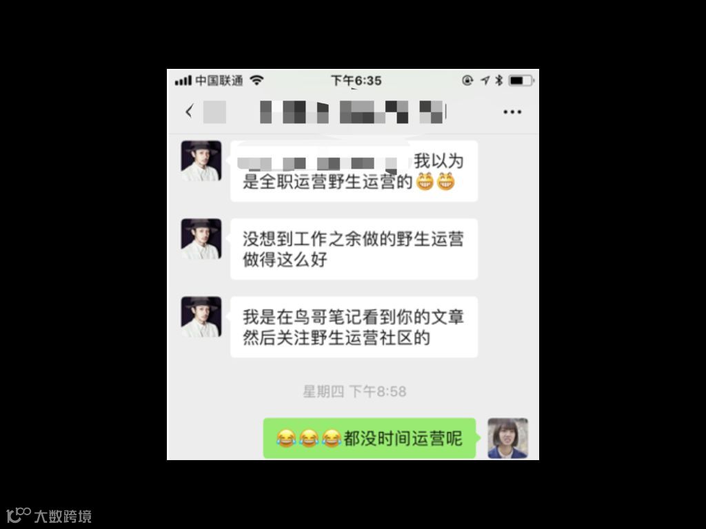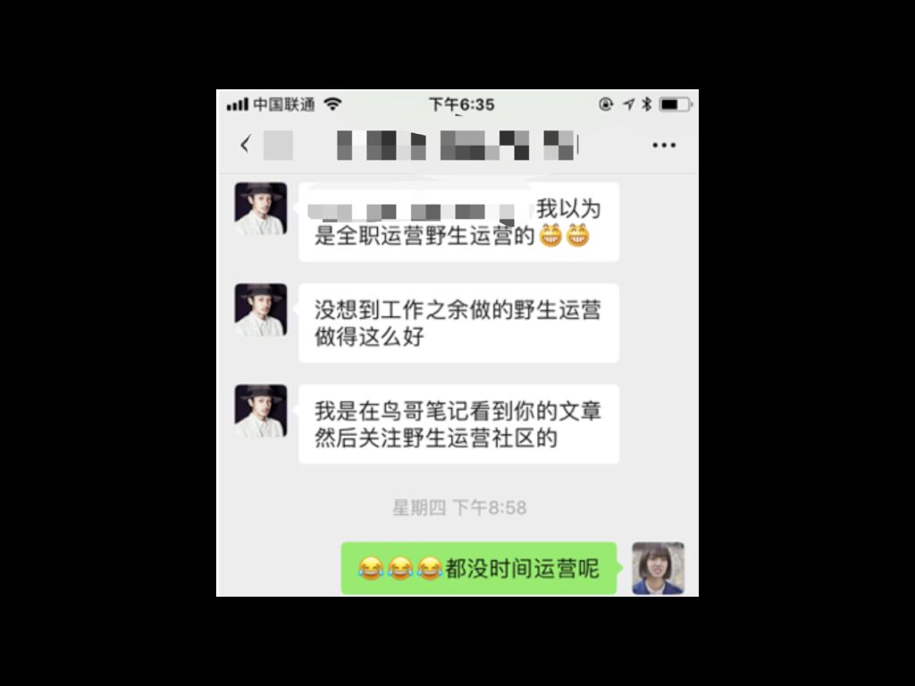 群里的小伙伴告诉我,他之前以为我是全职在做这个社区,我告诉他,我其实有正经工作滴😂而且加班频率就摆在那里,他表示很震惊,他跟我说,感觉这个群是有个专业团队在打理,这和他以前加入的群完全不同,无论群的活跃程度,还是话题的优质程度,亦或是群的生命周期都在他以往进过的群之上,他已经退了很多群,但野生运营群他一直没有退,即使不说话,也能从这个群获得很多营养。