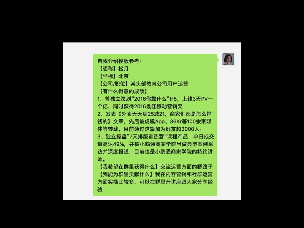 从这里我就知道,跟我认识这位小伙伴有什么样工作成绩,为我之后邀请到群里分享做埋点,相信我,高手都在民间。而且一般我会要求进群前,先把个人资料发给我看,这样我能根据他的能力模型,匹配不同的群,每个群里的人,其能力基本构成要保持相对均衡的状态,比如社群运营、用户运营、产品运营还是技术,要处于一个合适的占比,这样才能在群里的交流中碰撞出更多的火花。