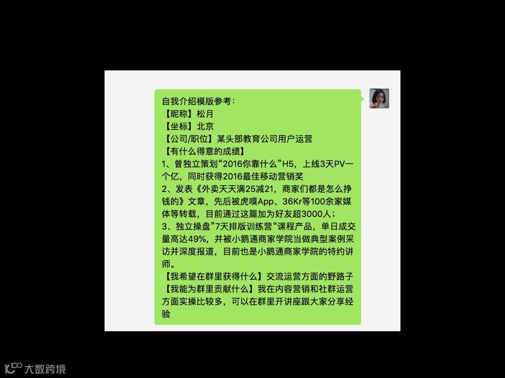 2)分享1个有用的资料,既可以是自己的项目复盘,也可以是行业资料,和群里成员互通有无