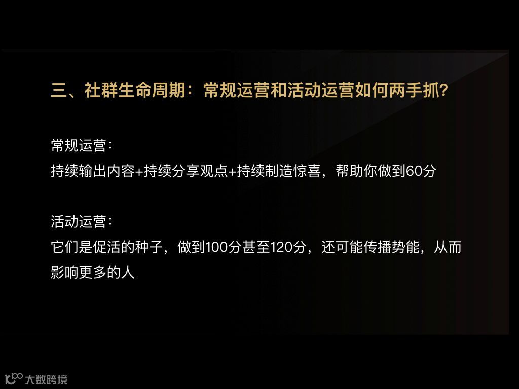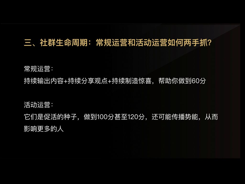 1、常规运营,3个持续,做好运营基本面,做到60分