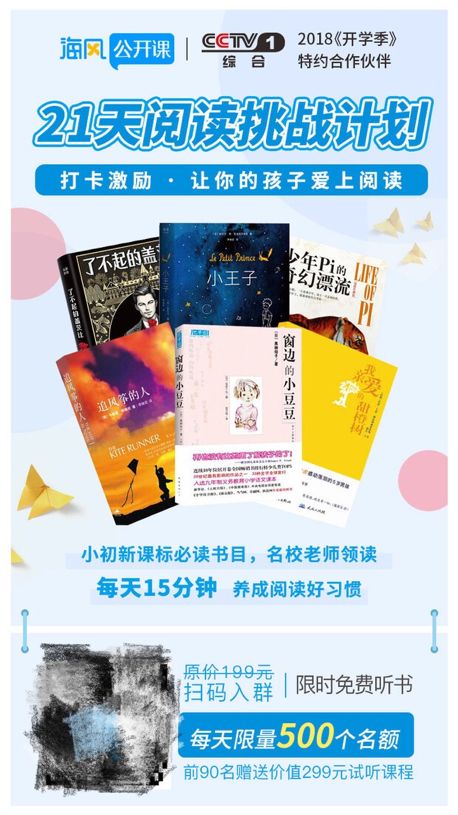 比如下方海风教育的海报,在免费的前提下,增加“每天限量500个名额”促使用户产生紧迫感,进一步增加用户愿意行动的可能性,大大降低决策成本,是很有效的手段。