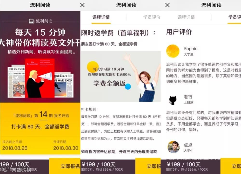再比如阅读打卡产品,把「承诺一致性」这个要素放在产品设计里,像“打卡满xx天退学费”、“打卡坚持xx天分现金”等等。