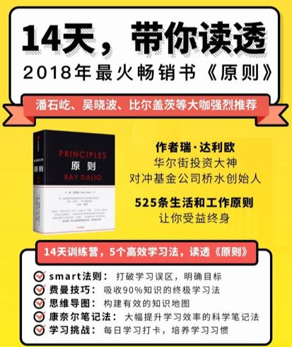 比如圈外同学的阅读训练营,主标题的「14天带你读透《原则》」、课程大纲列出的各种名词和效果描述,都是利用了「承诺」,告诉用户坚持14天就可以获得什么,满足内心期待,促使用户行动。