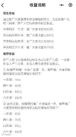 还拿成长兔英语举例,它就规定了推广大使邀请学员买课、邀请好友成为推广大使,可以获得不同的收益,并且根据被推荐用户购买课程的年限、被推荐推广员的首单及招生情况,设计了不同额度的收益,顺序是依课程年限递增。