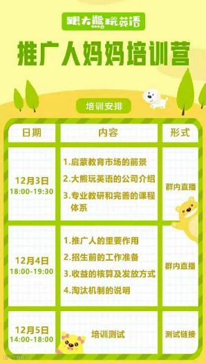 比如跟大熊玩英语,其培训推广员的课程里,就包含了市场前景、公司介绍、课程体系、招生技巧、收益及淘汰机制等几个方面的内容,比较全面,而且运营上有标准化流程,用微信群直播,会有答疑和内容整理,体验很轻。