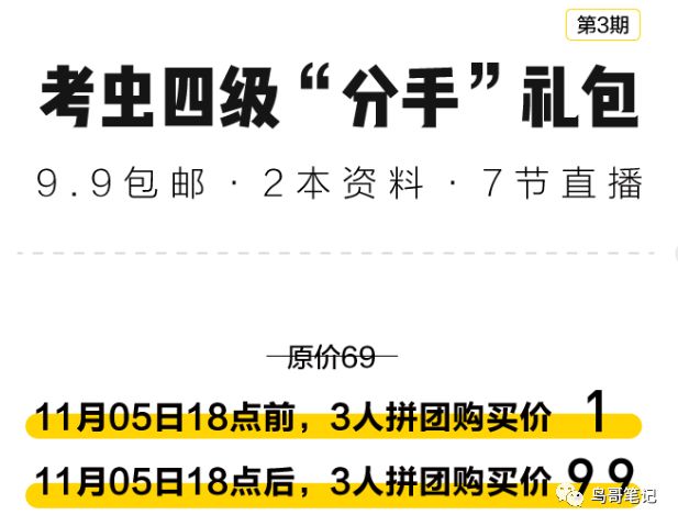 从今年起,考虫的“黄色炸药包”(即课程随材)席卷全国高校校园,甚至变成校园里一道靓丽的风景线。“黄色炸药包”不仅正价课送,引流课也送,价格更是低到难以置信,三人拼团仅1元,而且还包邮!