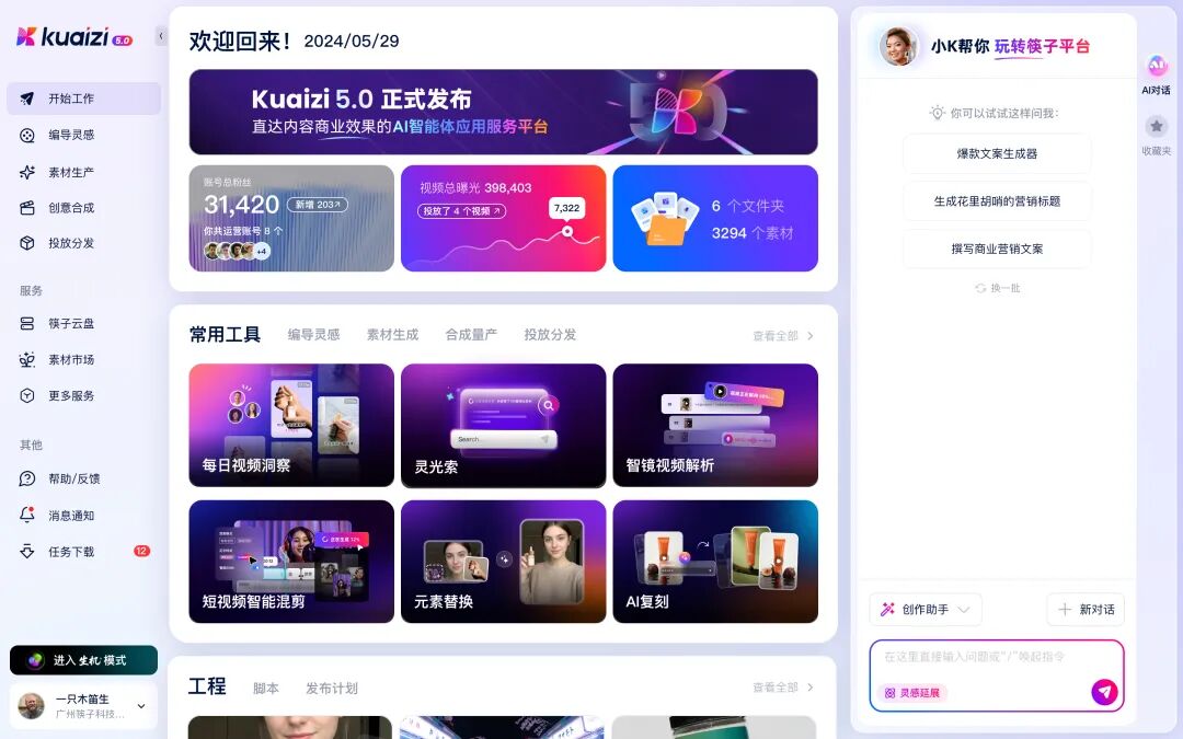 行业首创 “生机Agent” :Kuaizi 5.0推出的生机Agent可自启动、自运行、洞察趋势,自动发现生意机会,真正让一个人也能开启全球视频生意。