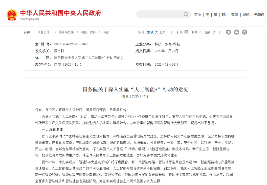 2025年8月26日,国务院正式发布了 《国务院关于深入实施“人工智能+”行动的意见》 ,为未来十年中国的智能化发展设定了清晰路线图。