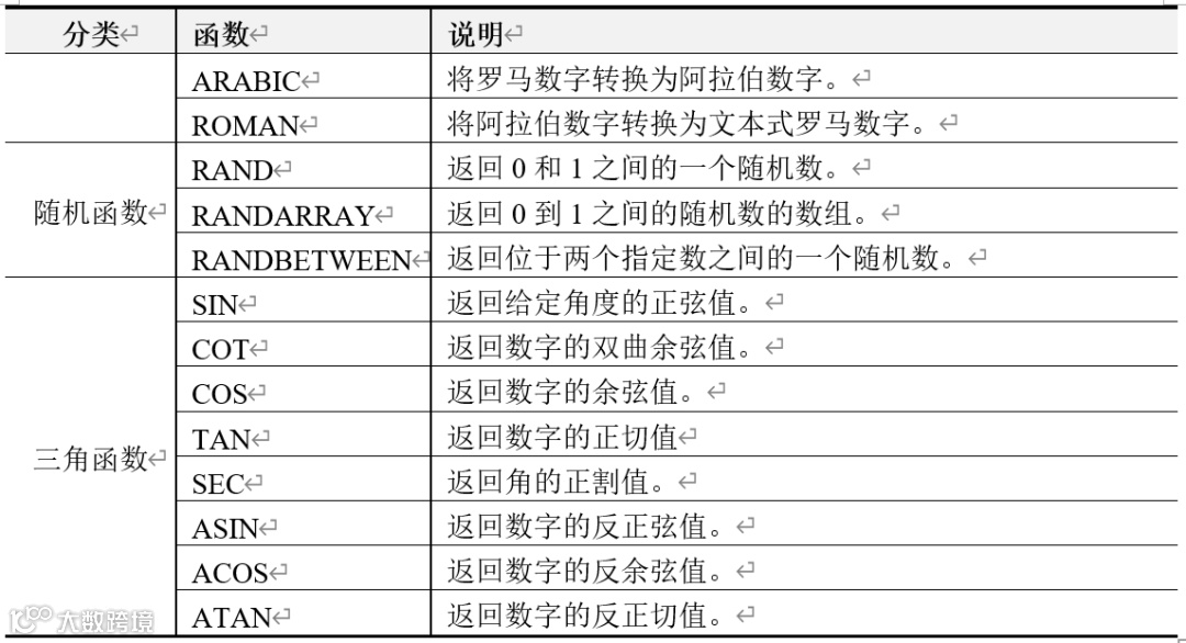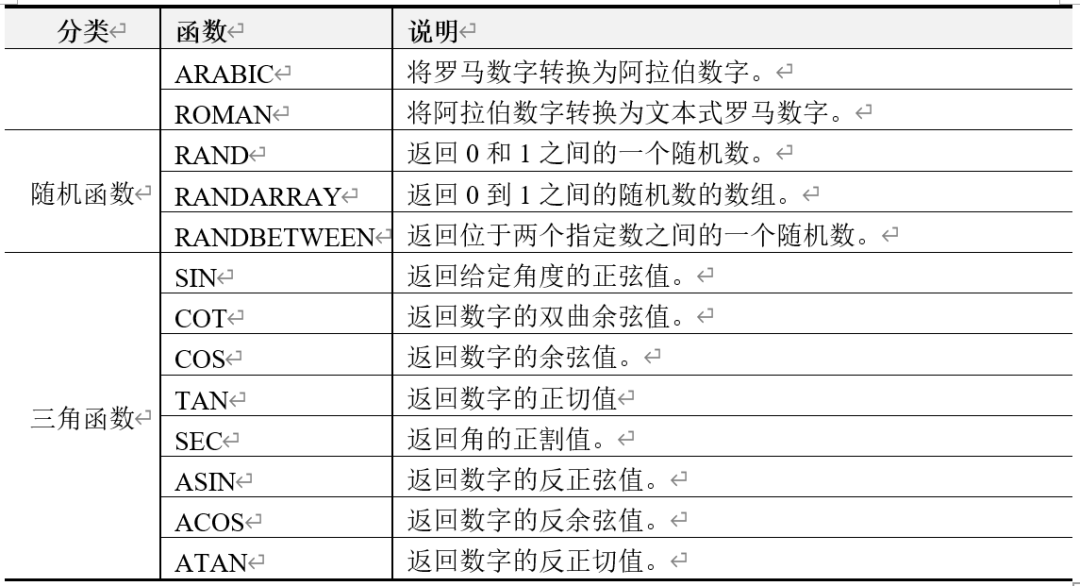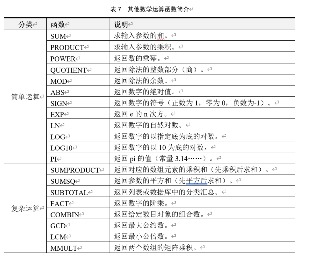 在Excel当中的运算函数种类繁多,除了上述最为常用的基础运算和修约函数外,还提供了很多的复杂运算函数(由不同种类的多个基础运算步骤组合的运算规则)、随机函数、三角函数等等,限于篇幅不再一一展开说明。但是并不妨碍各位同学对一些可能会用到的函数进行简单了解,因此在表8.7中按类别列写了一系列运算函数并进行了功能的简单说明供初步的了解和学习。待实际工作中遇到相关需求时可以再回头进行检索,并根据帮助文档掌握函数的基本使用方法。值的说明的是,一般专业性越强、功能本身更复杂的函数,使用起来灵活度会更低,也代表着更容易学习和应用,这一点和上述讲解的常用的基础函数不同。