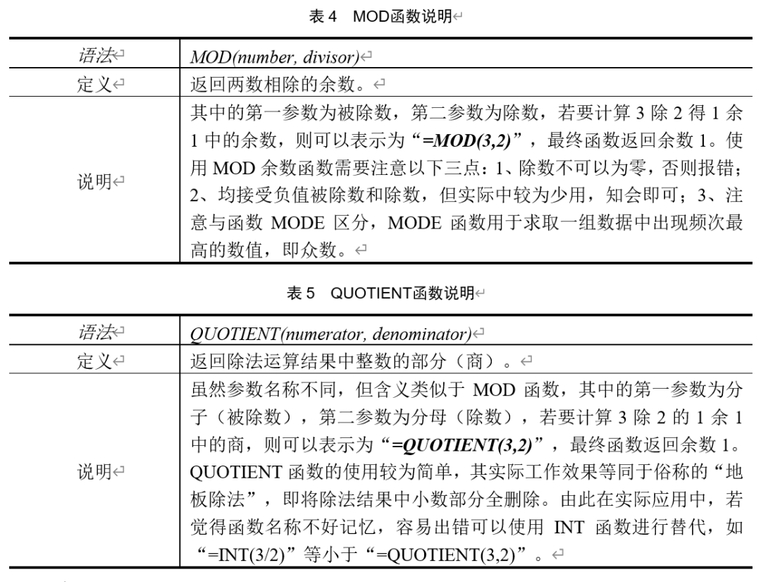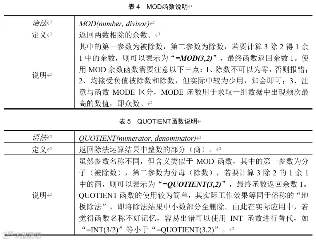 最后,在基础运算中还有一种特别的极其常用的运算:求余数和求商。在Excel当中分别使用MOD和QUOTIENT函数来完成,函数详情请参看表4和表5。