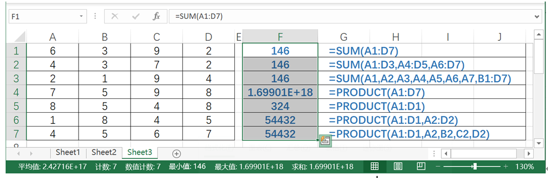 对于大部分基础的运算来说,在多数情况下都会直接使用运算符来完成运算。但是依旧存在一些特殊情况,比如需要相加或相乘的原始数据较多时,则会使用函数来进行批量的计算,比如SUM求和函数和PRODUCT乘积函数,使用效果如图4所示。