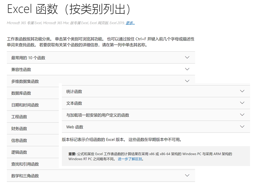说明:在Excel当中共有约80种数学与三角类函数,基本可以解决所有可能会遇到的初等数学运算需求。详情参看微软官方文档:https://support.microsoft.com/zh-cn/excel帮助页面中“函数与公式/函数/按类别划分/数学与三角函数”清单,如图1所示。其他类别函数及具体说明也可以在相关页面查看。