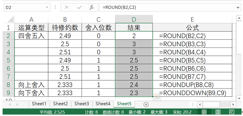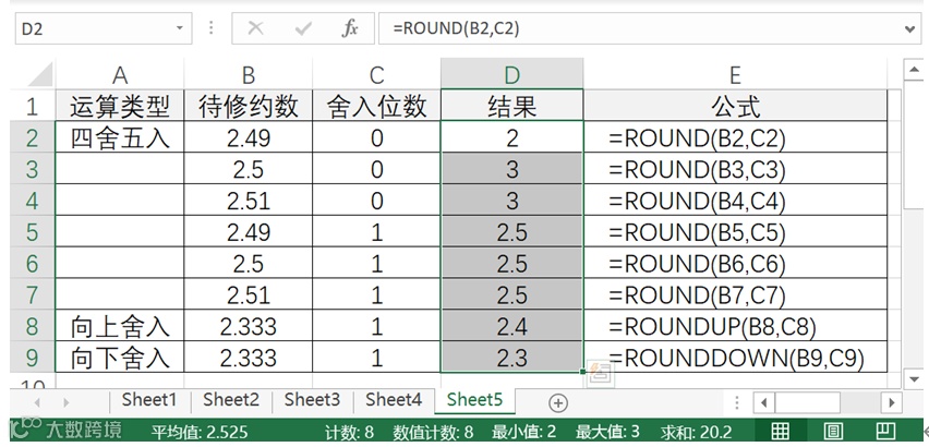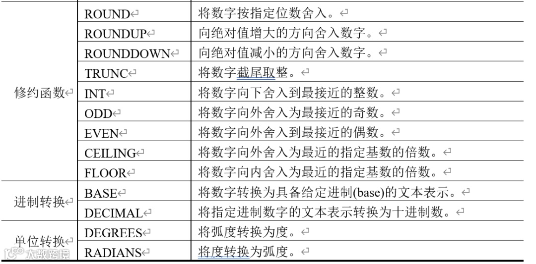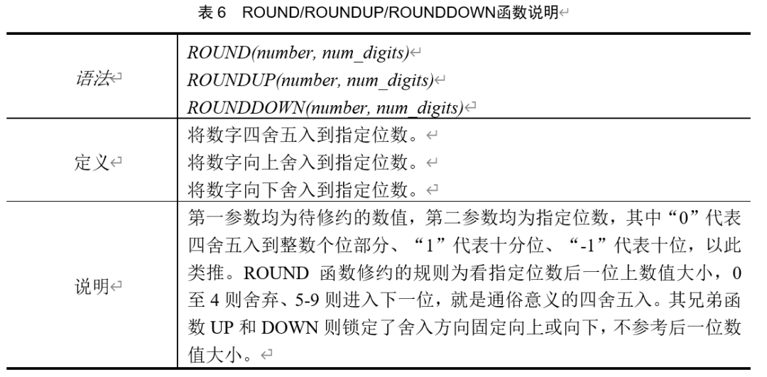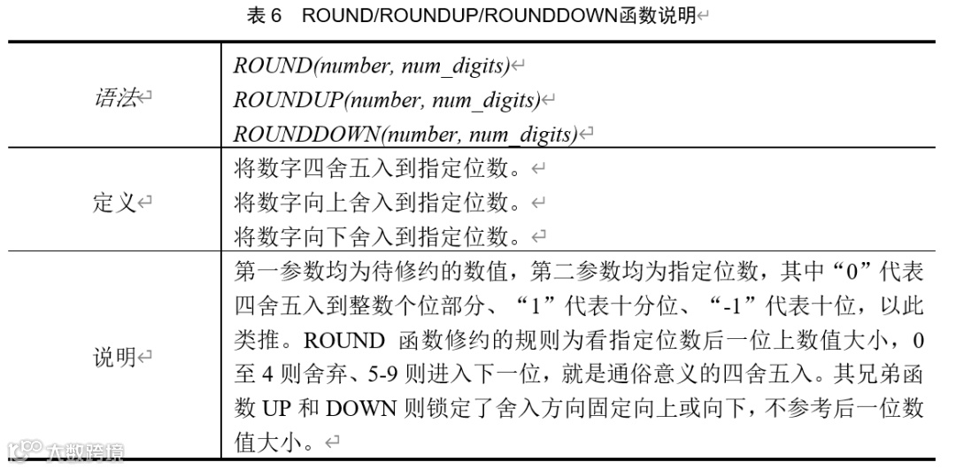首先是最常用的四舍五入函数ROUND及其兄弟函数ROUNDUP/ROUNDDOWN函数。ROUND字面意思是大概、圆角,引申可以理解为平滑,因此可以理解为对数据取一个大概值,使数据更平滑的意思。在使用的过程中只需要提供待修约的数值和修约位数即可,效果如图7所示,函数详情见表6。