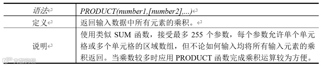 如图所示为不同引用方式的乘积效果,因为加法和乘法均满足交换律,因此对参数的输入顺序没有要求,并且输入的形式既可以是单元格区域也可以是单个单元格,最终均可以实现对所有元素的运算,PRODUCT函数说明详情请参看表8.1。