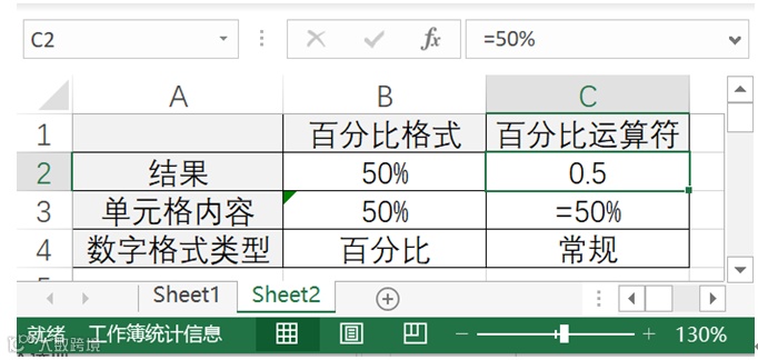 注意:在使用百分化运算符“%”时容易产生混淆地方是其“使用范围”。通常情况下,上述所有介绍的运算符均是应用于函数公式内的,必须在公式编辑栏中以等于号“=”开始的公式内容中使用。但百分号运算符属于一个特例,它既可以在公式中运用,也可以直接作为常量值输入在单元格中,比如“=50%”和“50%”均是合法的,能被Excel正确识别为“0.05”。虽然总体效果类似,但需要理清楚的是在单元格中发挥作用的其实已经不是百分号运算符,而是Excel将百分号“%”视为一种特殊的格式标记,在遇到该标记后自动将其设置为“百分比”数字格式,实现原理上有一定差异。对比情况如图3所示。