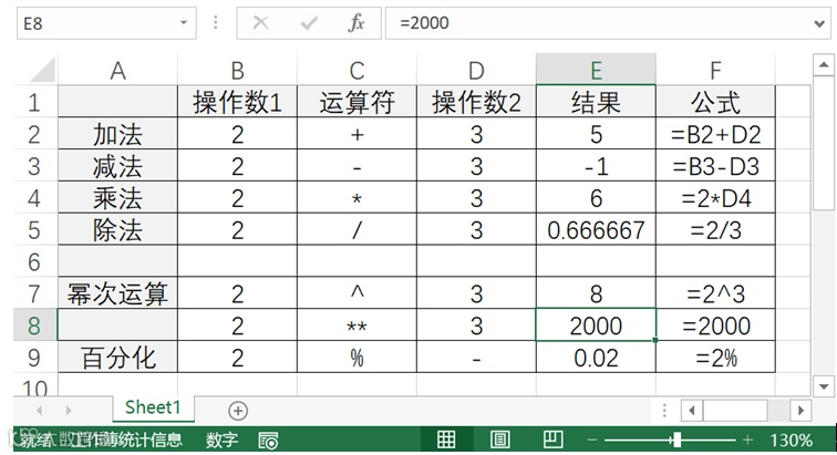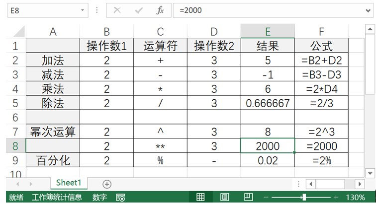 在Excel当中基础的四则运算(加减乘除)及一些常用的计算如幂次运算、百分数化运算等都可以通过简单的运算符直接在公式当中完成,如图2所示。