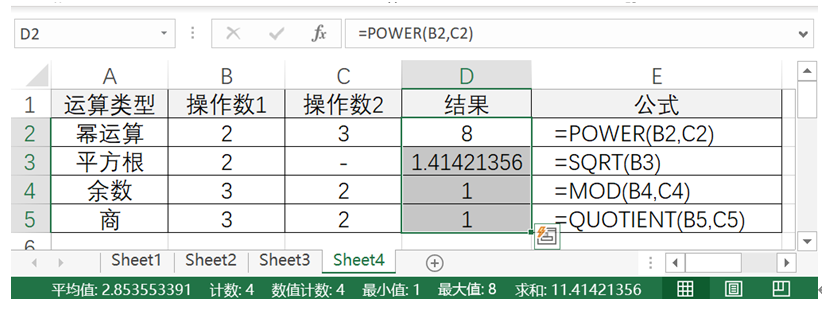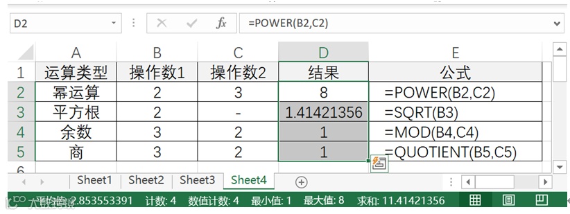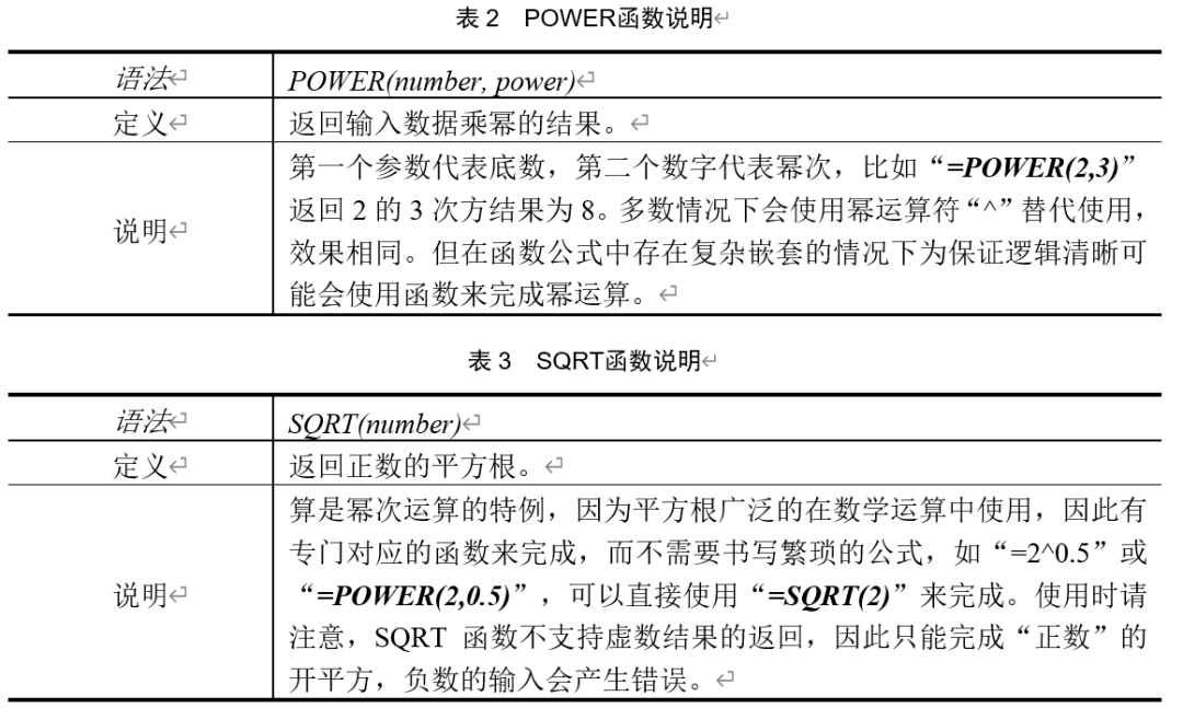 除求和乘积外,幂次也有其对应的函数形式POWER函数,以及特殊幂次开平方的SQRT平方根函数可以使用,详情见表2和表3。