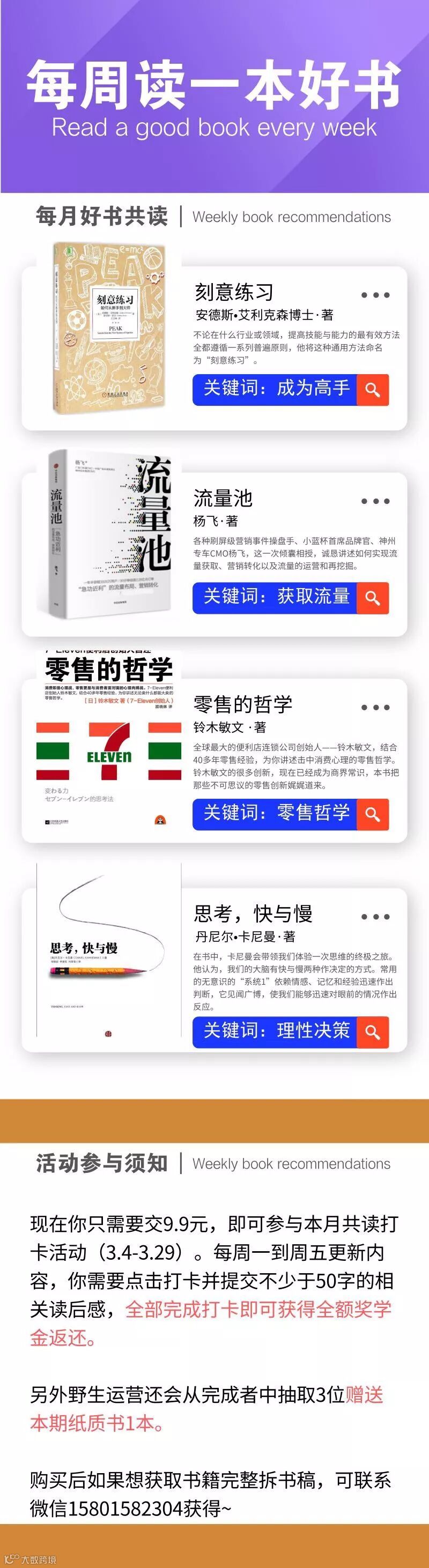 读书会和一般的知识付费产品一样,需要一个“爆”点,让人一下子能记住你,而这个“爆”点设计的最好方法就是打造一个活动,或者是设计一个有吸引力的用户体验流程。