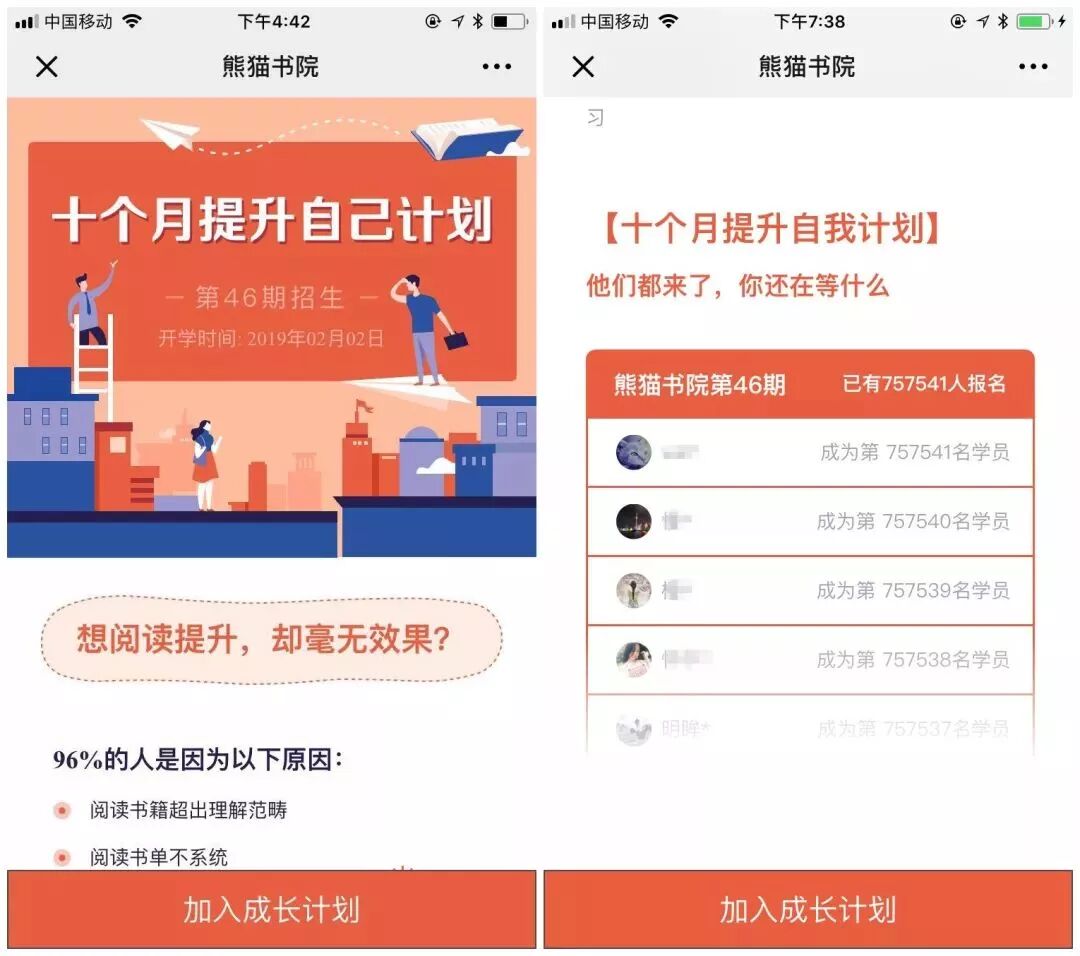 熊猫书院,主打“10个月提升自己”计划,每天给用户安排15分钟学习,10个月就可系统学习9大领域知识,解决用户不知道读什么、不知道怎么读的困扰,辅以校园式的学习模式(记考勤、有辅导员、不能来学习需请假),上线之初曾达到日打卡10W+的骄人战绩。