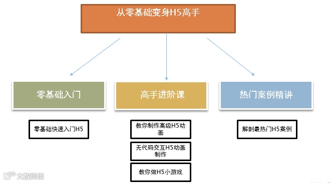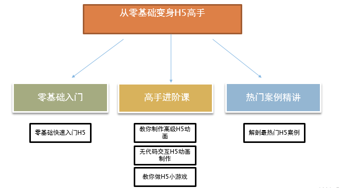 一套完整的标准化H5课程,目标受众应该是想学习H5的用户:小白、有一定基础的还有专业级高手,所以我们推出的第一套标准化H5课程,设置了如下学习路径:
