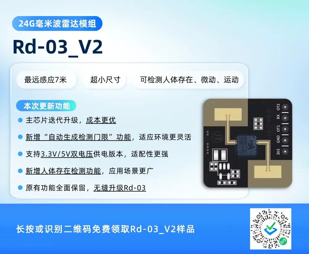 此功能将原有Rd-03雷达模组的应用从“是否有人移动”延伸到“是否有人在场”,Rd-03_V2大大增强了其在智能办公、酒店、卫浴节能控制等场景下的应用能力。
