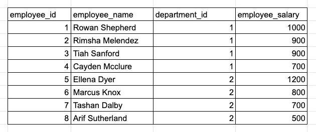 ROW_NUMBER() OVER (PARTITION BY department_id ORDER BY employee_salary DESC) AS rank_in_dep