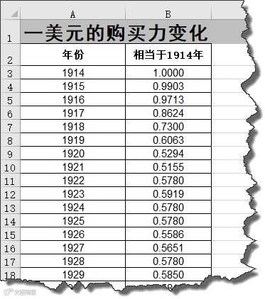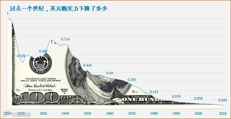 与100年前相比,美元的购买力出现大幅下降,这早已经不是什么秘密,但这些年来美元的购买力到底下降了多少呢: