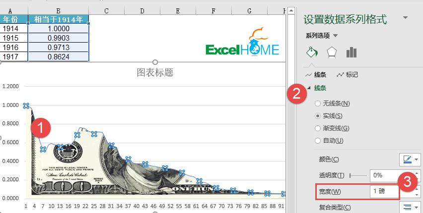 单击选中折线图,设置线条宽度为1磅。