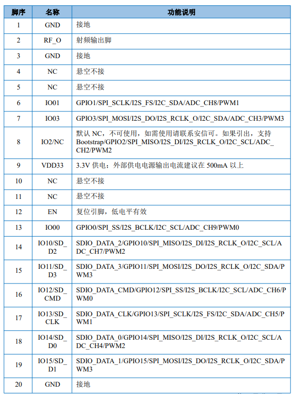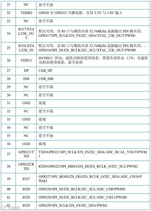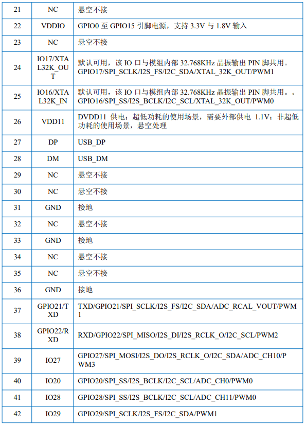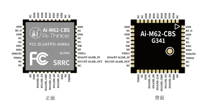 Ai-M62-CBS 模组共接出 44 个管脚,如管脚示意图,管脚功能定义表是接口定义。