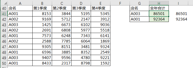 =SUM(IF(A$41:A$50=G41,B$41:E$50))