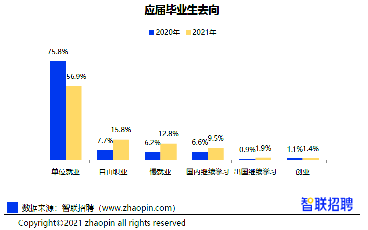 在参与本次调研的2021应届毕业生当中,56.9%的大学生选择毕业后加入就业大军,较去年收缩18.9 个百分点;15.8%选择自由职业,同比上升8.1 个百分点;12.8%选择慢就业,同比上升6.6 个百分点。另外,毕业后在国内继续学习的应届生占比9.5%,较去年的6.6%也有明显提升。