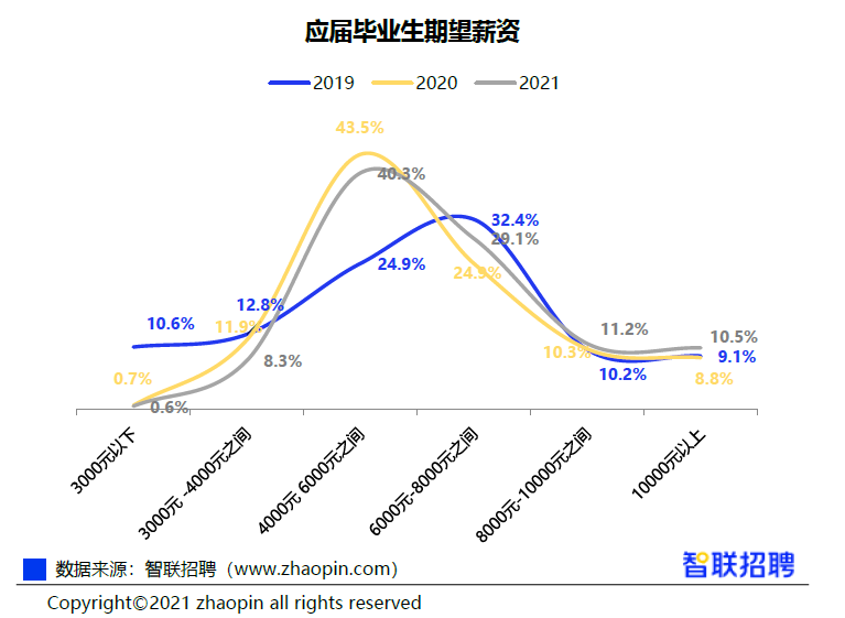 2021应届毕业生的期望薪资同比有所上升,但不及2019年。应届毕业生期望薪资分布聚焦在4000-6000 元区间内,同比来看相差不大。反观2019年,3000元以下的低薪区间占比超1成,但应届生薪资期望在6000-8000元区间达到高峰,可见2021应届毕业生整体薪资期望仍未突破疫情前。
