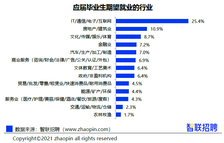 IT/通信/电子/互联网以超过四分之一的选择占比成为毕业生最期待从事的行业,排在其后的是房地产/建筑业(10.9%)、文化/传媒/娱乐/体育(8.7%)、金融业(7.2%)。新一代求职者作为“信息时代原住民”,对互联网行业自带热情,而信息技术的日新月异、层出不穷的互联网明星企业,也激发毕业生的浓厚兴趣。