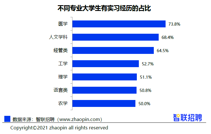 从不同专业来看,医学专业由于注重实践能力,实习基本为必选项,其毕业生有实习经验的占比最高,达73.8%。排在其后的是人文学科(68.4%)与经管类专业(64.5%),应届生多通过实习经历来弥合专业设置与职场应用之间的鸿沟,并为自己简历增色。
