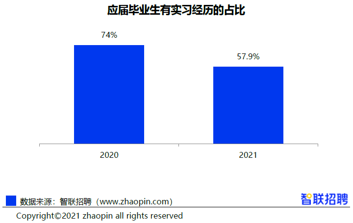 2021 年,57.9%毕业生在校期间有实习经历,比去年下降16.1 个百分点。但实习对大学生来说仍非常重要,9 成毕业生认为实习经历对找工作有利。
