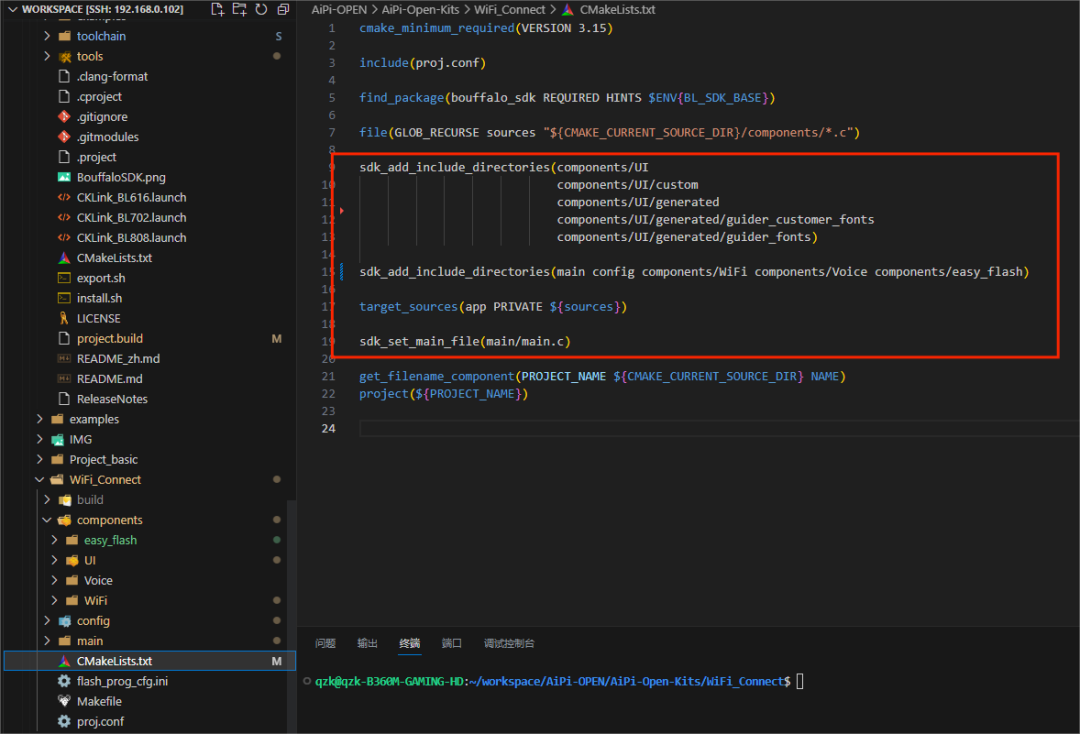 commponents 中添加了部分库,包括 easyflash,UI(设计的 UI,屏幕与触摸的配置),Voice(8388 的驱动库),Wi-Fi(一个WiFi连接的库,在 Project_base 中可以copy 过来)。准备好需要的驱动后,配置 CMakeLitst.txt(可以参考以下截图中的方式)。