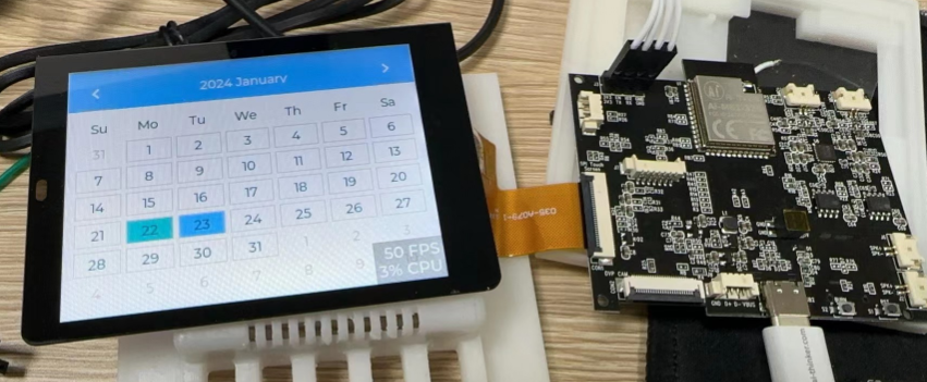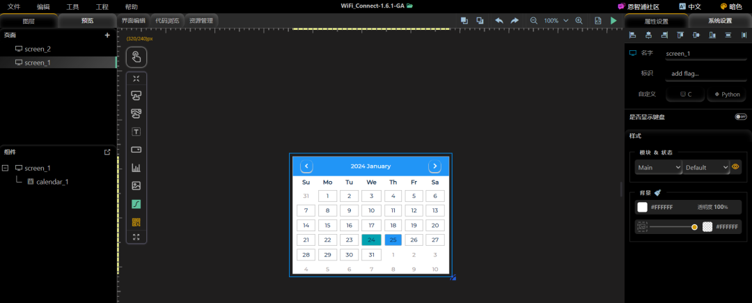打开 GuiGuider,依旧是熟悉的新建工程,不熟悉的伙伴可以看之前的教程复习一下。这里设计两个界面,第一个界面为一个日历(摆饰)。