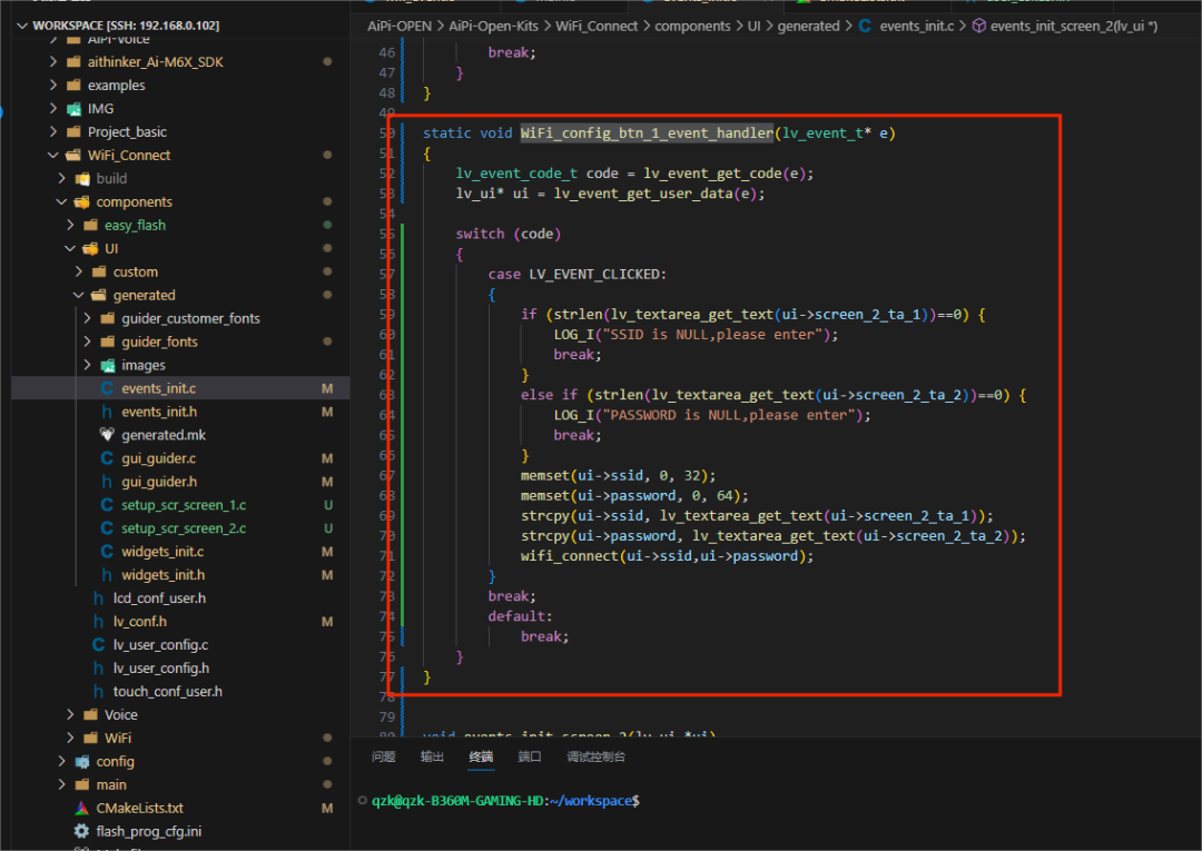 这里使用防御性编程,先判断获取框中的内容是否为空,添加 if 和 else if 语句,随后清空缓存ssid和passsword数组,将输入框中的内容通过 strcpy 输入到缓存中。这里调用Wi-Fi库中已经编写好的wifi_connect 连接Wi-Fi。记得将 wifi_event.h 添加到头文件中。注意这里面的 ui 全是一个结构体指针,指向 guider_ui 这个全局的结构体。注意完成后将编写的函数在页面 2 的初始化中,使用 lv_obj_add_event_cb 添加事件。