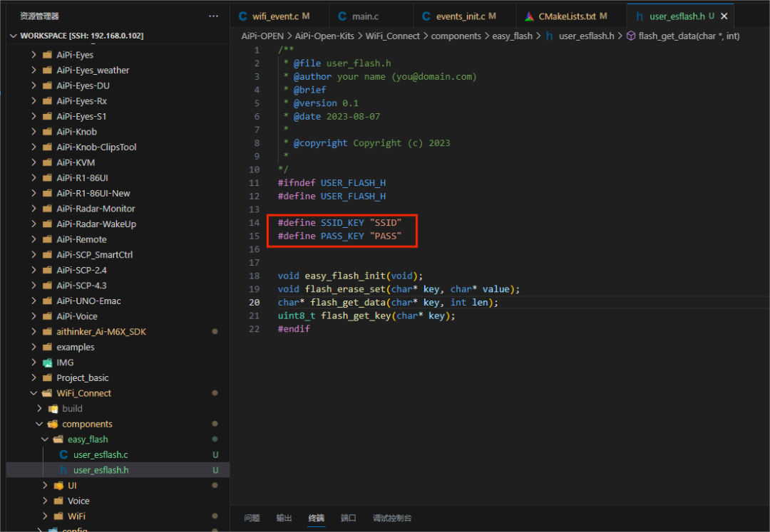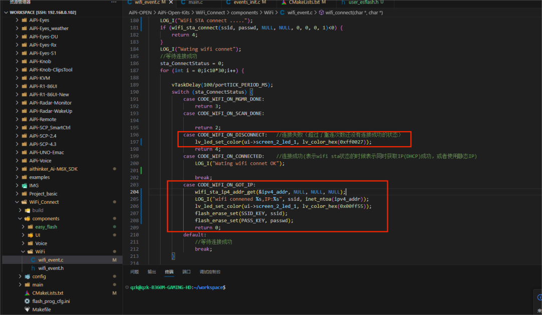 在wifi_connect 函数中,这里面也有一些Wi-Fi的连接状态,都是基于这个 sta_ConnectStatus来判断。在连接失败时修改“LED”灯状态,对应 lv_led_set_color,这里的 ui 定义了临时变量并将全局的 guider_ui 的地址赋予它。同样在成功连接后,也就是获取 IP 时修改 LED 的颜色,同时将Wi-Fi的ssid 和password写入Flash中,通过字段保存。字段定义在easy_flash 的 user_esflash.h 中。在其它文件中使用 Flash 注意将头文件也添加。