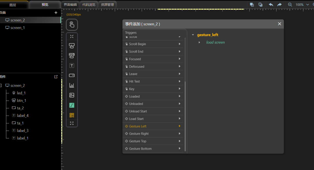界面UI设计成功后,为界面添加两个事件,分别为左划和右划来切换不同的界面。这里点击界面2(Wi-Fi 连接界面)——添加事件——选择 GestureLeft(左划),在通用这里勾选 load screen——加载界面,选择界面1(日历界面)。