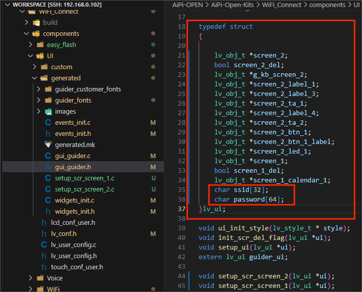 该.h 中也是通过extern来声明该结构体已在外部定义,可以在 lv_ui 中添加 ssid 和 password 数组来暂存我们的 Wi-Fi 名称和密码。