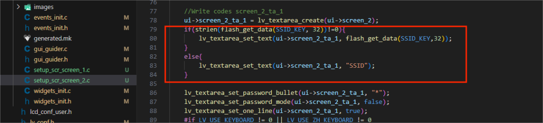 最后在WiFi_Connect/components/UI/generated/setup_scr_screen_2.c 中,也就是对应界面2初始化内容来修改,通过Flash 判断上一次成功输入Wi-Fi且被储存的内容是否存在,来显示上一次连接的Wi-Fi名称和密码,就不用重复输入。