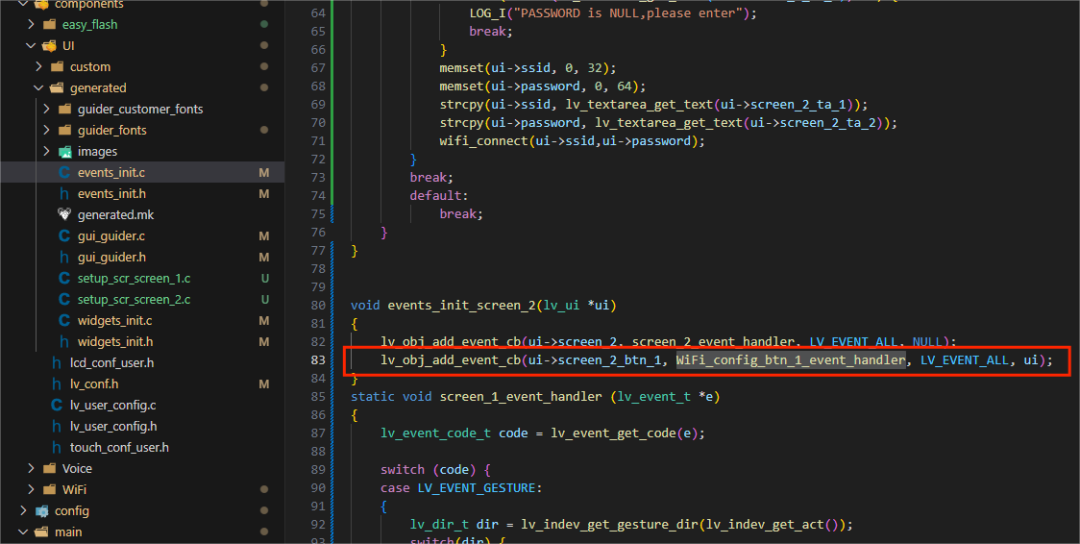 在 WiFi_Connect/components/UI/generated/events_init.c 中注册一个按钮事件,这里面可以看到左划右划切换界面的事件,区域中显示的是界面 2,对应Wi-Fi 连接界面,在文件中注册一个事件,对应按钮btn_1,可以参考笔者写的方式,可以看到 case 中对应的枚举类型是 CLICKED(点击)。