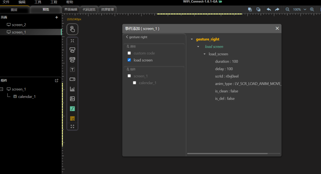 保存后同样的步骤,点击界面1(日历界面)——添加事件,选择 GestureRight(右划),同样的加载界面选择界面 2(Wi-Fi 连接界面)。