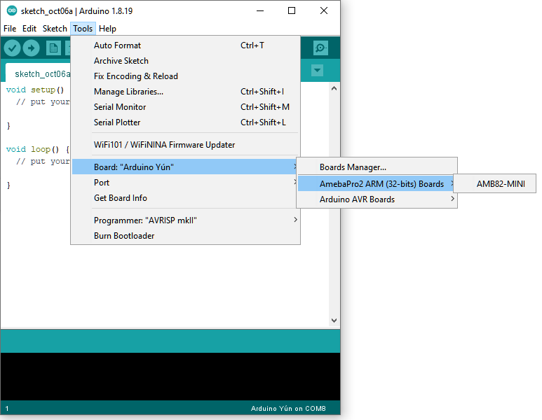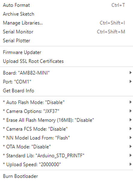 最后在 "工具"->"开发板"->"AmebaPro2 ARM (32 位) 电路板"->"AMB82-MINI "中选择开发板。