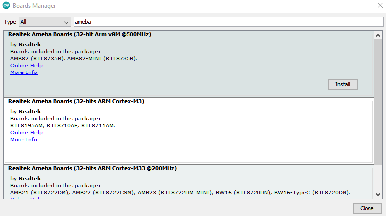 每次连接新硬件时都需要重新打开电路板管理器。在列表中找到 "Realtek Ameba Boards",点击 "Install(安装)",然后 Arduino IDE 就会开始下载所需文件。